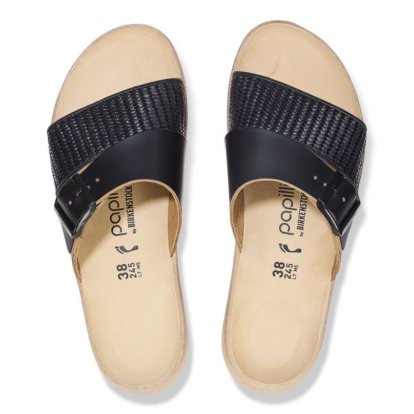 Il sandalo Almina di Papillio è un sandalo plateau con una leggera zeppa. Questo modello affascina le donne che amano la moda e la comodità, grazie alla sua grande stabilità e aderenza date dall'ampia fascia sul collo del piede. La combinazione tra la struttura naturale della rafia e la pelle liscia dà vita a un look unico e vistoso per l'estate.