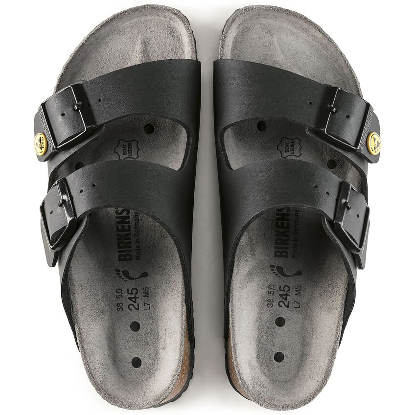 Grazie all’elevato comfort di calzata e al plantare dalla forma anatomica in sughero e lattice, il sandalo Arizona di BIRKENSTOCK con due cinturini è ideale per l’uso quotidiano sul posto di lavoro. La dotazione supplementare ESD contro le scariche statiche spontanee fa di questo modello la scelta migliore per l’impiego in ambiente ESD. La combinazione del plantare con la suola speciale assicura una continua scarica al suolo e la protezione dei componenti sensibili. Tutti i modelli BIRKENSTOCK ESD sono testati secondo i requisiti della norma DIN EN 61340 e soddisfano i parametri in ambiente ESD di 1,0 x 105 bis 3,5 x 107 Ohm.