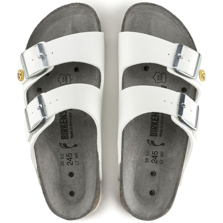 Grazie all’elevato comfort di calzata e al plantare dalla forma anatomica in sughero e lattice, il sandalo Arizona di BIRKENSTOCK con due cinturini è ideale per l’uso quotidiano sul posto di lavoro. La dotazione supplementare ESD contro le scariche statiche spontanee fa di questo modello la scelta migliore per l’impiego in ambiente ESD. La combinazione del plantare con la suola speciale assicura una continua scarica al suolo e la protezione dei componenti sensibili. Tutti i modelli BIRKENSTOCK ESD sono testati secondo i requisiti della norma DIN EN 61340 e soddisfano i parametri in ambiente ESD di 1,0 x 105 bis 3,5 x 107 Ohm.