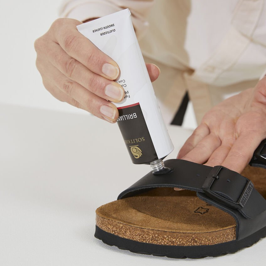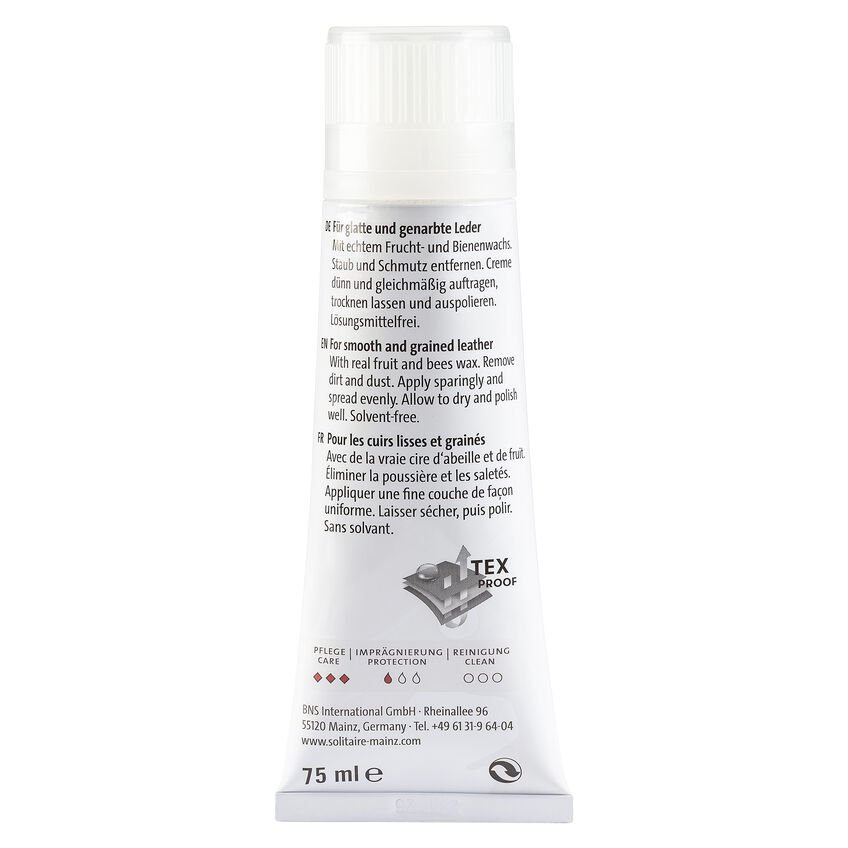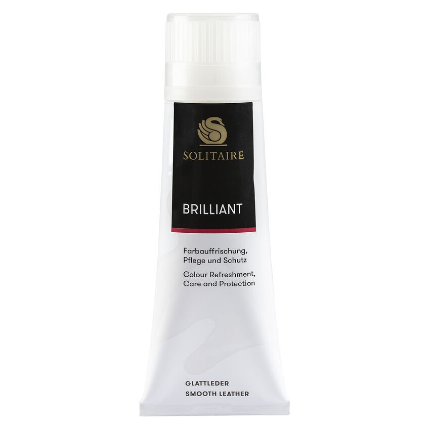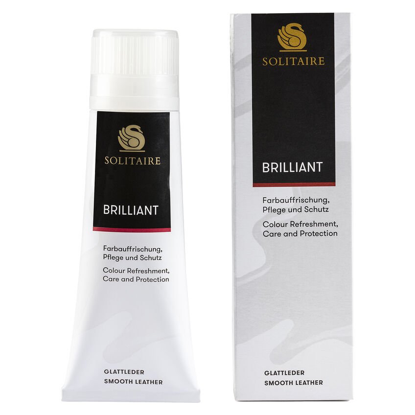 La Brilliant Cream del nostro partner Solitaire è particolarmente adatta per la manutenzione e l’impermeabilizzazione della pelle liscia nera. Nutre e protegge il materiale, conferisce brillantezza e può essere utilizzata anche sulla pelle morbida e sulla pelle anilina.