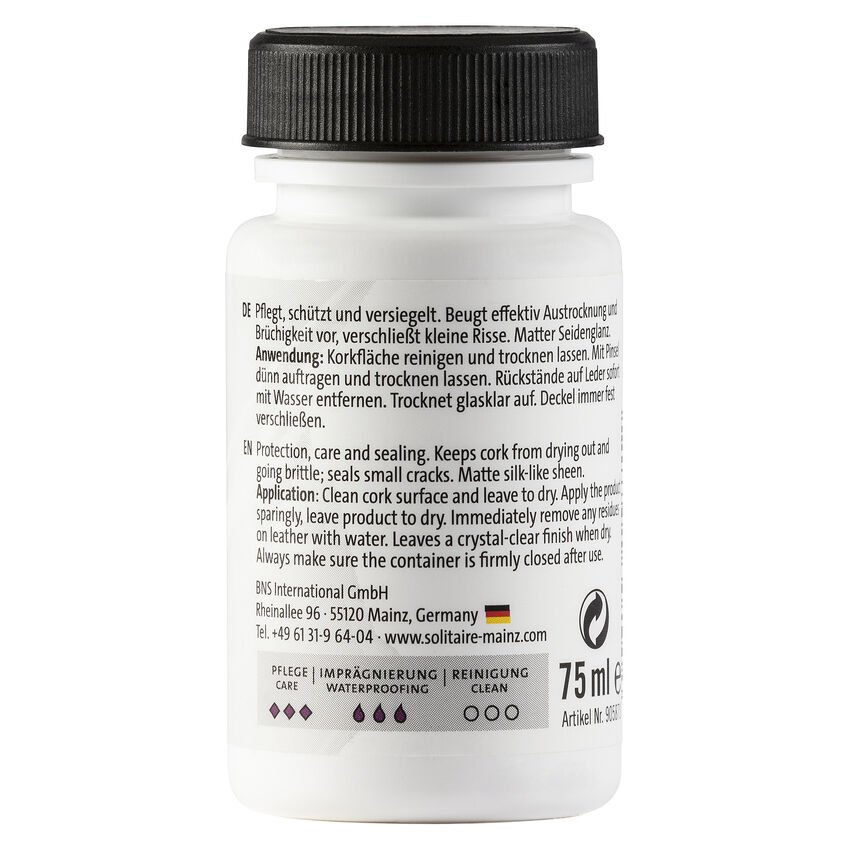 Utilizzo: dopo aver rimosso lo sporco grossolanamente, applicare una piccola quantità di prodotto con il pennello sul bordo essiccato della suola in sughero e lasciare asciugare. Rimuovere subito con acqua i residui sulla pelle – per esempio sulla suola interna del plantare – o sulla suola esterna.