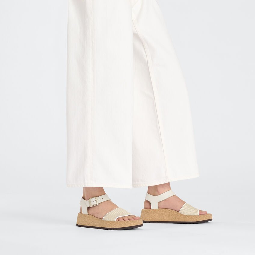 Il sandalo Glenda di Papillio è un sandalo plateau con una leggera zeppa e plantare integrato. Questo modello affascina le donne che amano la moda e la comodità, grazie alla sua grande stabilità e aderenza date dall'ampia fascia sul collo del piede e dal cinturino per il tallone Nonostante sia un sandalo robusto, conserva un aspetto femminile. Questa versione è in un coloratissimo look in lana che fa pensare alla tessitura. La tomaia è composta da un mix di pelle naturale e materiale sintetico delicato sulla pelle.