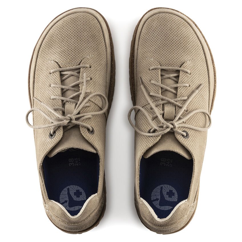 BIRKENSTOCK Honnef è una scarpa stringata con un’ampia suola in sughero. Il cosiddetto mudguard, la parte inferiore della tomaia sulla punta della scarpa, protegge dallo sporco e rende questo stivaletto ancora più resistente. La parte del tallone è imbottita per garantire maggiore comodità. Il plantare Deep Blue è comodo e leggero e rende questa scarpa così confortevole che può essere indossata sempre senza problemi, anche in quelle giornate che non finiscono mai, piene di cose da fare. Perfetta per il prossimo viaggio, per lunghe passeggiate o per un giro in città. La tomaia è composta da pelle scamosciata perforata, che aderisce al piede come una seconda pelle.