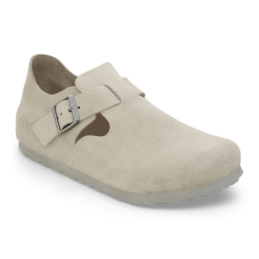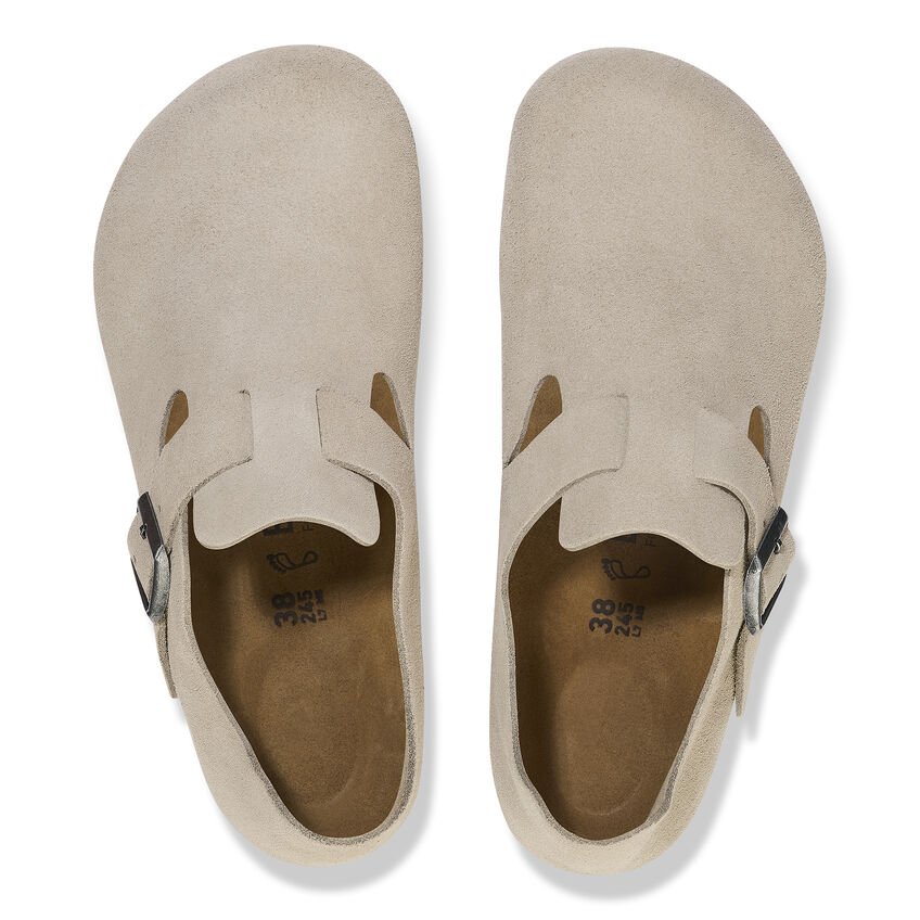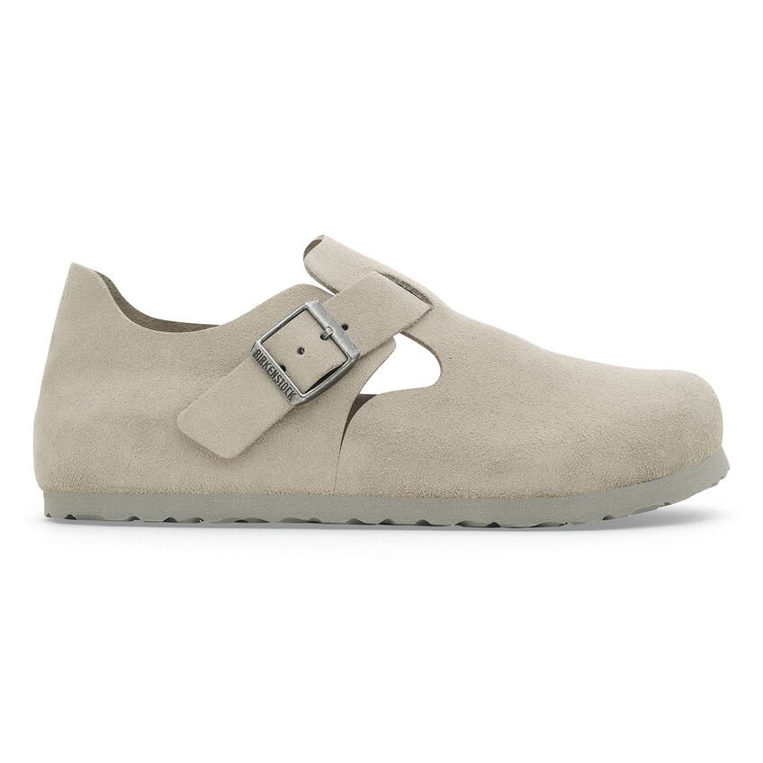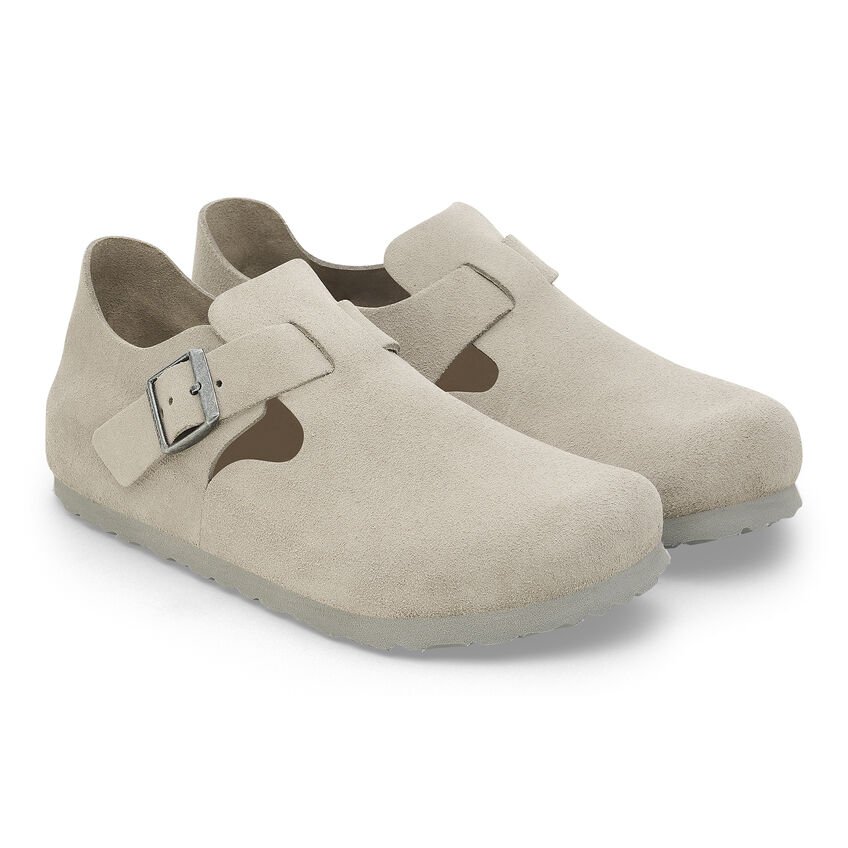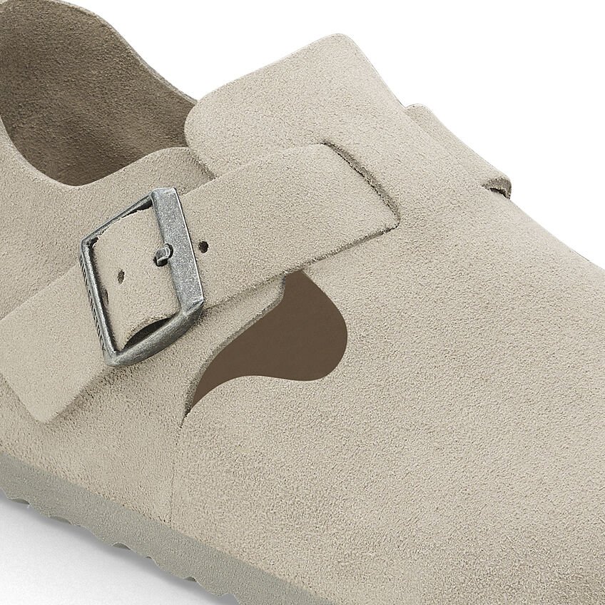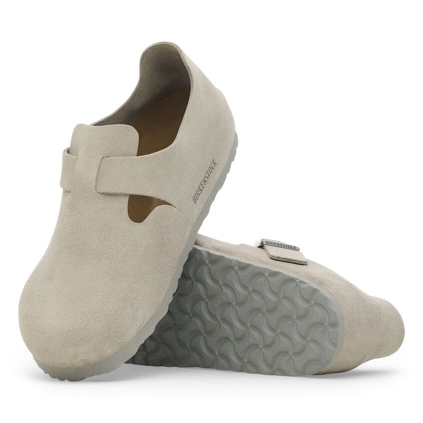 BIRKENSTOCK London è una variazione del classico Boston. Questa scarpa bassa si presenta nella sua sobrietà senza cuciture e la parte del tallone è rialzata. Il suo aspetto naturale e rustico è sorprendente, così come la lavorazione a cuciture aperte e senza rivestimento. Le fibbie in colore coordinato donano la percezione tattile di un tessuto e con il loro design opaco danno ancora più risalto al modello. La tomaia è composta da pelle scamosciata particolarmente morbida, che aderisce al piede come una seconda pelle.