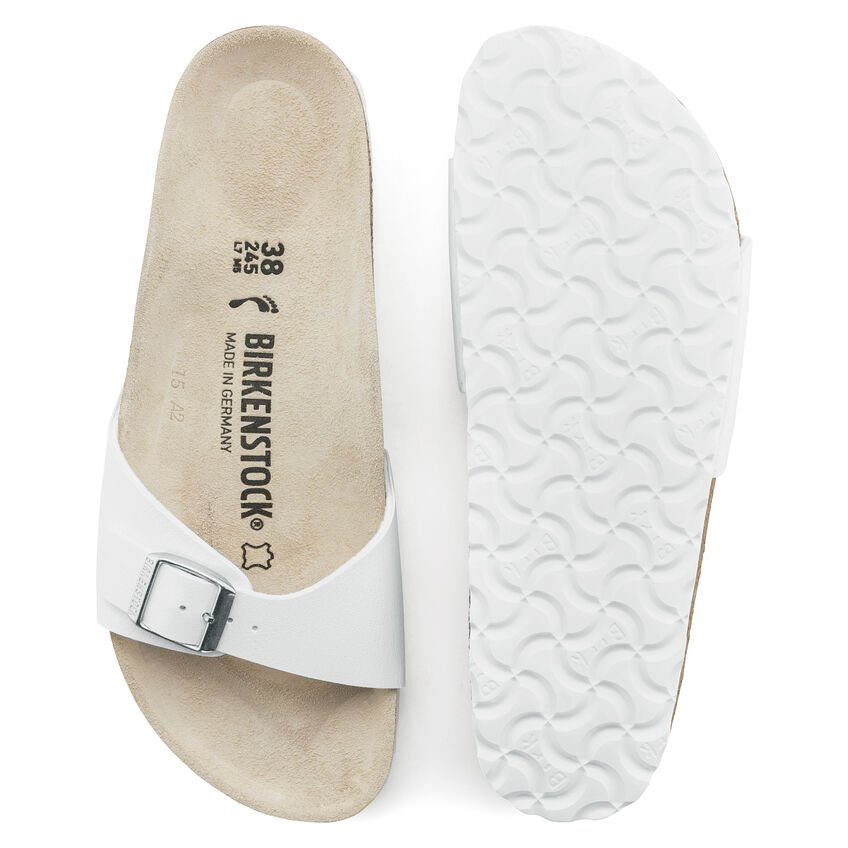 La pianella BIRKENSTOCK Madrid è il primissimo modello della grande famiglia BIRKENSTOCK e, a ragione, è considerata un vero classico. Lanciata mezzo secolo fa sul mercato come “pianella da ginnastica", questo modello a cinturino unico dalle linee essenziali è diventato ora una vera icona di moda. La tomaia è in materiale sintetico Birko-Flor® dermoaffine e resistente.