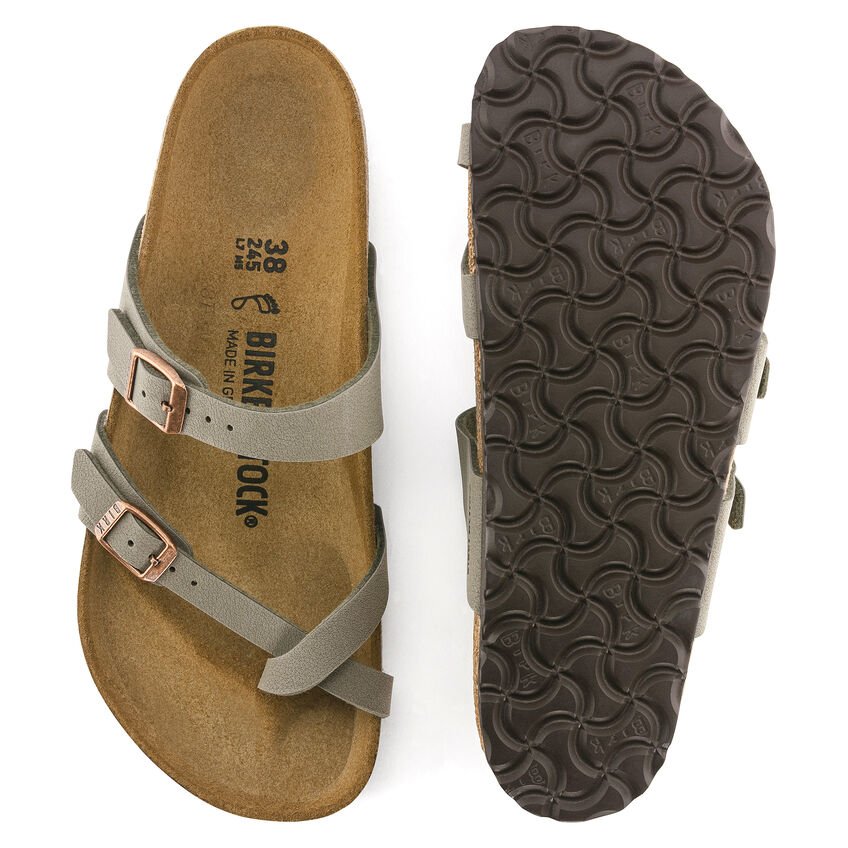 Il sandalo BIRKENSTOCK Mayari è un infradito dalla forma slanciata con cinturino incrociato attorno all’alluce. Il riuscito connubio di design e comfort fa di questo infradito, elegante e comodo al tempo stesso, la scelta ideale per donne e uomini attenti alla moda. La tomaia è in materiale sintetico Birko-Flor® dermoaffine e resistente e presenta un raffinato effetto Nabuk. Grazie alla speciale lavorazione, la tomaia può essere facilmente scambiata per vera pella sia per colore che per texture.